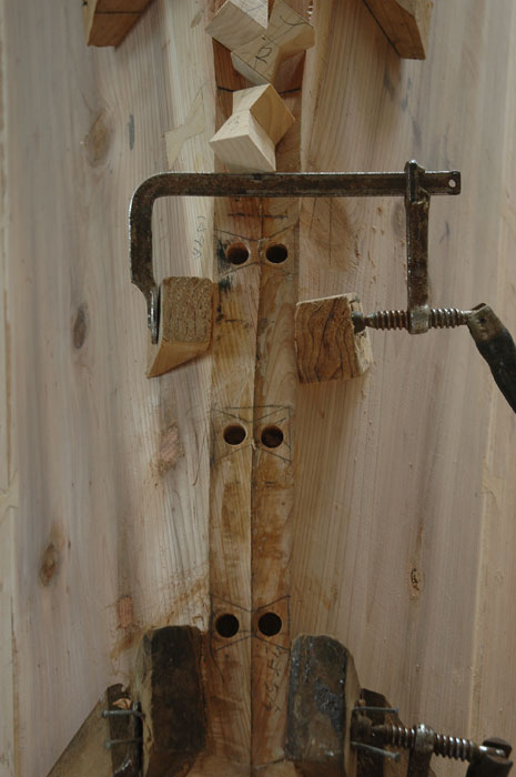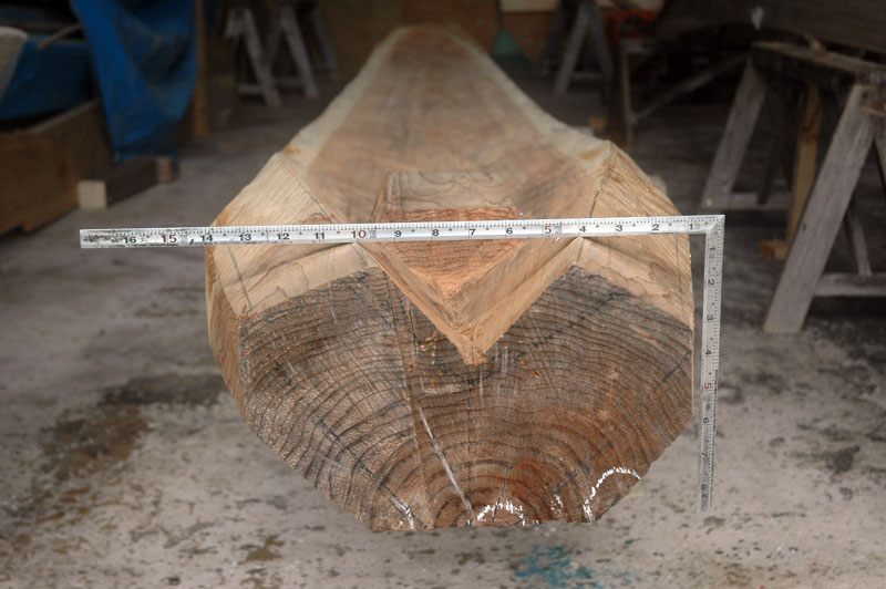 作業を始めたときに底材は一番薄い所で三寸の厚さがありました。最終の厚さは二寸二分半になるだろうと下門さんは言いました。私は削り取る材の多さにもう呆然としてしまい、どうして最初から均一の厚さの木に挽かないのか理解できませんでした。でも下門さんは、材を合わせた時のようにこれも少しづつ進めていく必要があるのだと強調しました。私たちは舷側板の時と同様に、底材の中心線に幾つもドリルで穴をあけ、厚さを確かめながら2寸2分半の厚みまで窪みを削り取りました。底材の底から船縁の上まで垂直に測って前で1尺5寸5分、後ろで1尺4寸5分にすると言う事でした。この寸法が底部から削り取らねばならない材の量の目印となりました。