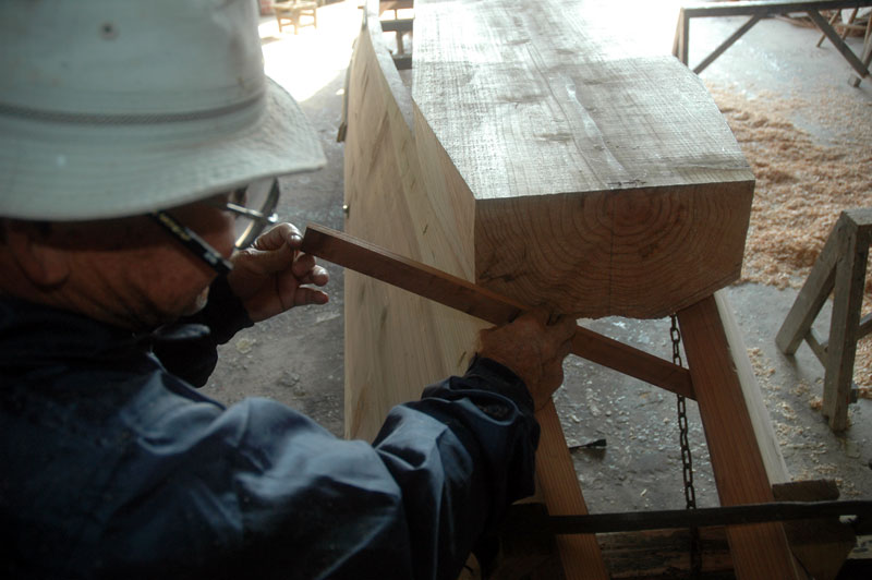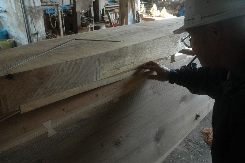 仕事場にはワイヤーロープが差し渡してあり、チェーンブロックを使って、私たちは底材を吊り上げ、舷側板になる曲げた板の上へと降ろしました。下門さんが目印をつける方法はとても興味深いものでした。まず差し金を離して持ち、差し金の一方の柄の下端を舷側板の縁に合わせます。それから底材に上端をあてて真っ直ぐに目印をつけます。その後、私たちが底部を舟から離して横の木挽き台の上に降ろします。一回転させた後、下門さんがこれらの目印を繋いで線を引きます。そして電動カンナで材をおよそ四分ほど取り去り、その線のところまで削りこみます。次は私たちが材をひっくり返し、吊り上げ、舟の上へ戻します。そしてまたおなじ過程を繰り返すのです。