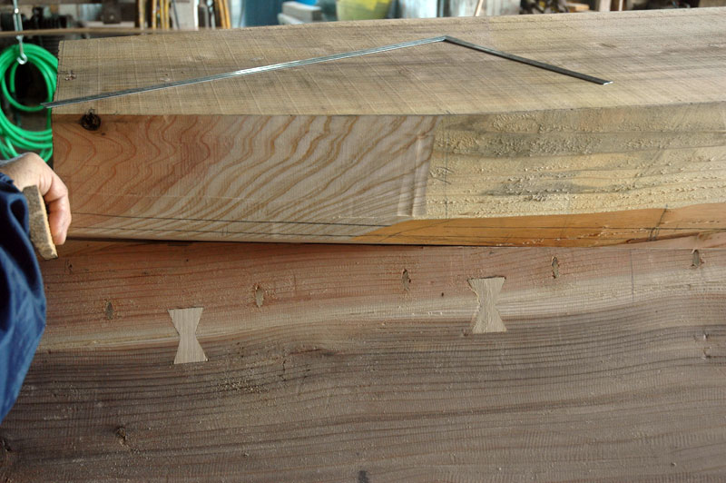 下門さんが三つの底材同士と舷側板との合わせにようやく満足したあとで、私たちは真ん中の底材を横に向けて木挽き台の上に置き、その上に脇の材を重ねました。下門さん、富雄さん、私の全員がスリノコで二つの平らな合わせ目を仕上げました。この仕事には私たちは真新しい手鋸を使いました、鋸を直角にするか、すこし傾けて使うのが一番いいと富男さんは私に説明しました。持ち手が上下に振らつかないで、しっかりと合わせ目に水平に保持する事が極めて重要です。そうしないと鋸は合わせ目からはみ出て木を切り込みかけるので、たえずチェックすることが大切です。富雄さんはこの工程を、切ると言うより撫ぜるのだと表現しました。(かれはそれをガラスのレンズを作る事に例えていました)抵抗が少ししか感じられない所でもゆっくり進む必要があるのです。おがくずが出ている限りは鋸は切れているのだと彼は言ってました。一つ目の合わせ目は両端でほとんど接していました。この部分を富雄さんは四回鋸を通して合わせました。そして中央部ではゆっくりと三回軽く通しました。全て完了するのには、それぞれの合わせ目につき約一時間ほどかかりました。