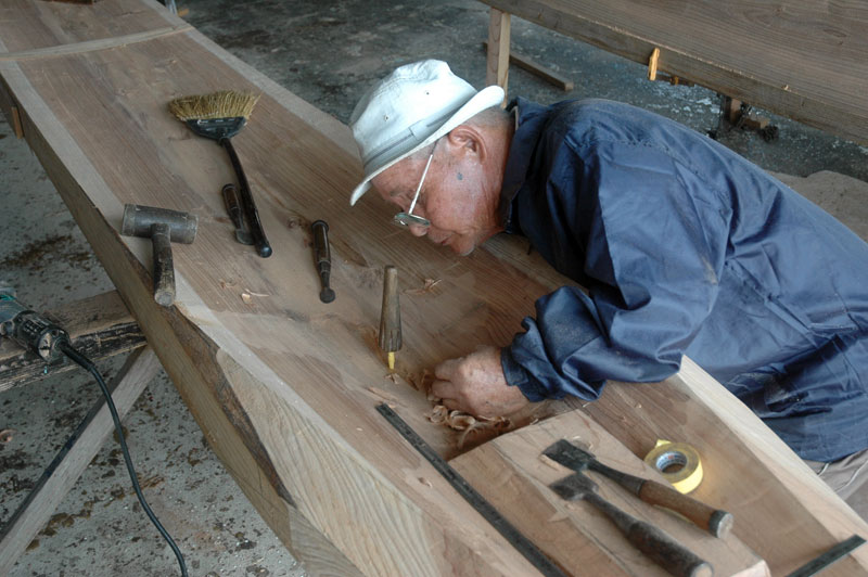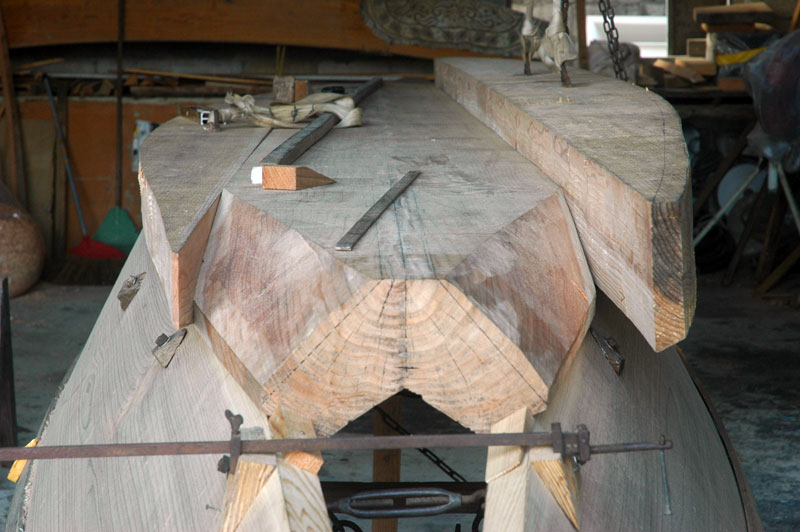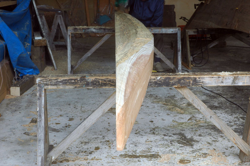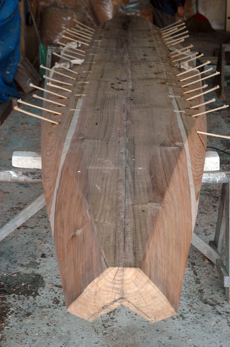 底部を合わせる途中で一旦仕事を中断して、底材の内側を刳り貫く作業に入りました。内側は既に富雄さんの手でチェーンソウで荒削りされていました。前端部では船首近くになるに連れてV字型形になるように削られていて。そこにマストステップになる大きな材の塊が削り残してありました。