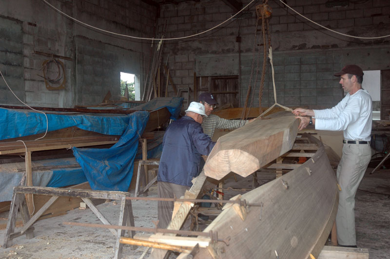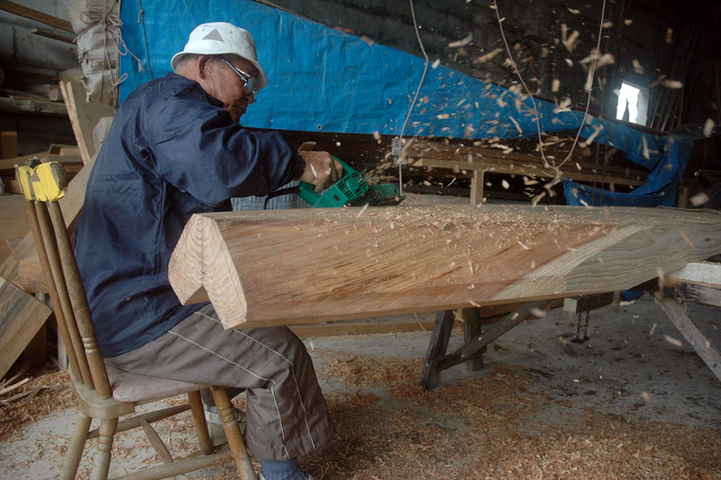 あるとき、下門さんは船の下に入っているときに私に合わせ目の話をしました。「どこが合っていて、どこが空いているか、舷側板の角は揃っているかよく見て覚えておかねばならないね」そして驚いた事に「なぜこんなに遅いのか不思議でしょう」と付け加えました。それは彼が手を休めて詳しい説明を私にする極めて稀な機会でした。材を切るときに材木屋に行って指図できなかったので、着いてみたら材が大きすぎた事を彼は指摘しました。卒中を患ったせいで、もうチェーンソウは使えないので小さく切る事は出来なかったのです。昔は底材を船本体にほんの三、四回合わせただけで、チェーンソウで削り合わせ最終仕上げへと持っていくことができた。と彼は言いました。また、今まで作ったサバニの多くは単一の材で底を作ったのでより簡単だったとも言っていました。