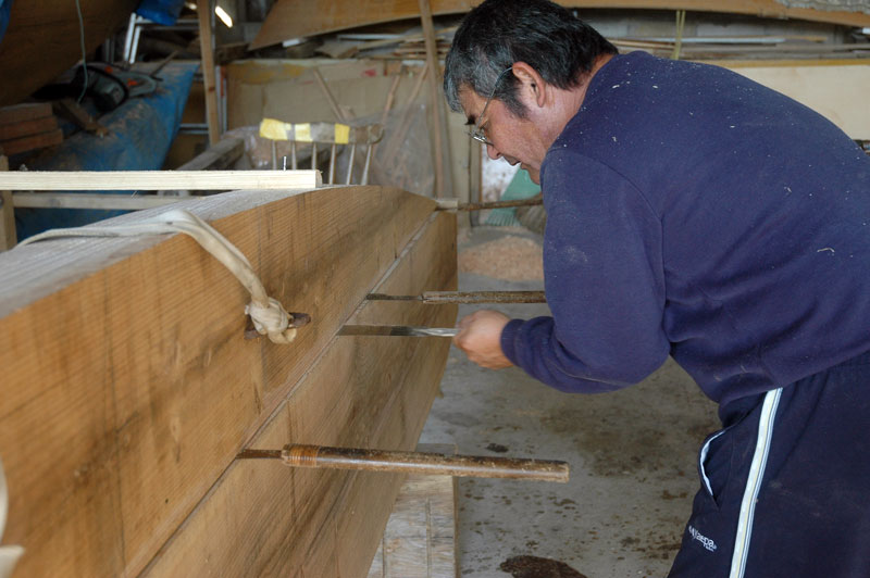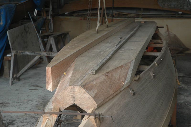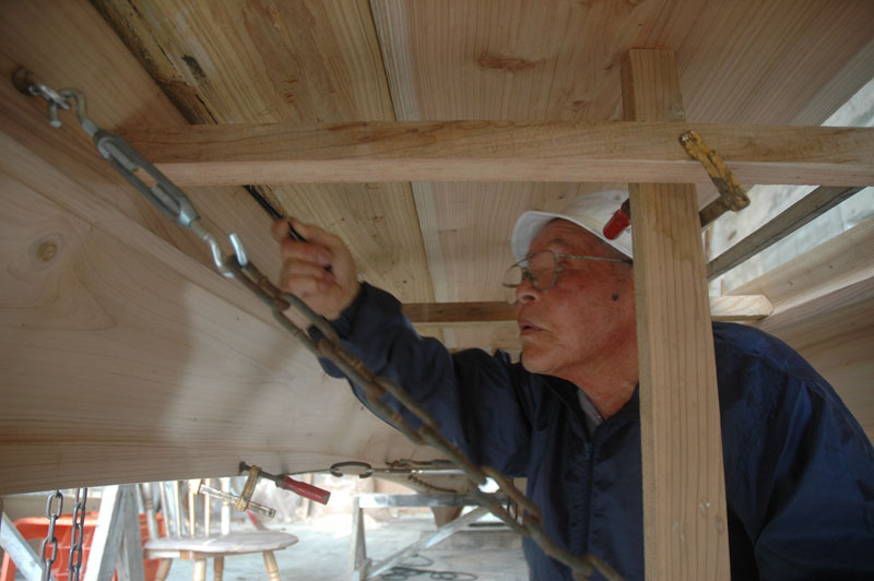 私たちはスリングが取り付けられた二つのかすがいを脇の部材に打ち込んでチェーンブロックで引き上げられるようにしました。両端だけが舷側板に合えばいいだけの中央の材と異なり、この脇材との合わせ目は舷側板に沿って長い弧を描くカーブとなっています。最初の日は一番目の脇材を舟に合わせるのに10回も揚げたり降ろしたりしました。脇材を合わせるとき下門さんは舟の下に入り外側にも内側にも合わせ目を罫書きしました。