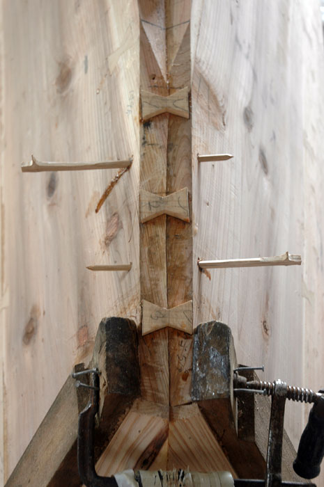私たちは底になる三つの部材を一緒に船体の上に置き、クランプで留めました。舷側板との適合具合に未だ満足していない下門さんは、これを解体して、一つの脇材に二回最終の合わせ作業を行いました。このときは、カンナで、ほんのすこしの材を取り除き、そして最終的に、底材は接着準備完了であると宣言しました。この時点で底は意図的にサイズを大きくしてあり、おおよそ五分ほど舷側板より広くなっていました。材の大きさを考えたら、カンナで合わせていく間にたぶんすこしひねりが出ると、下門さんは言いました。私たちの削り除けた材の量と、それが材の応力を変化させた事を考えるともっともな事です。私たちの最終調整は合わせるために脇材を動かしてから十六回にわたりました。