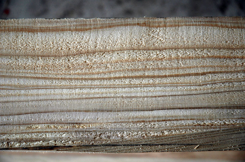 丸五日間の作業で底を形作る中央の材を仕上げ、共に底を構成する二つの脇の部分に取りかかりました。ここには中央部に使ったのと同じ杉の丸太を四分の一に切った部分が使われました。最初のステップは脇材と中央部の材とが接する端の面を平らにする事でした。後からこの合わせ面を仕上げる事になります。下門さんは差し金で確かめながら本当にゆっくりとそして丁寧に、電気カンナを使って、底を作るこの三つの部材をほとんど完全に合わせました。